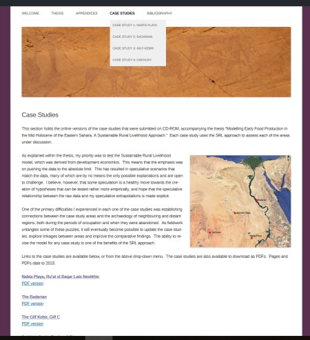 The thesis is supported by four case studies all looking at sites in the late Neolithic (Nabta Playa, the Badarian, Gilf Kebir and Dakhleh Oasis), which are saved on their own tab and are also available as PDFs on the Case Studies home page. For those whose primary interest is in one or more of the case studies, it is strongly recommended that you read Chapters 1 (introduction), 2 (explanation of the modelling approach), 5 (ethnographic research that informed the case studies), the relevant parts of 6 (background information to the case studies, including excavation history and notes about chronology), and 7 (the SRL template used in all the case studies), all of which are essential to an understanding of how the case studies were compiled and what they are designed to achieve. The case studies were never designed to be read as stand-alone pieces. If you do venture into the case studies, I suggest that you download the PDF versions because I have noticed problems with the way in which some of the data in the tables is displayed and it will take time to fix them.