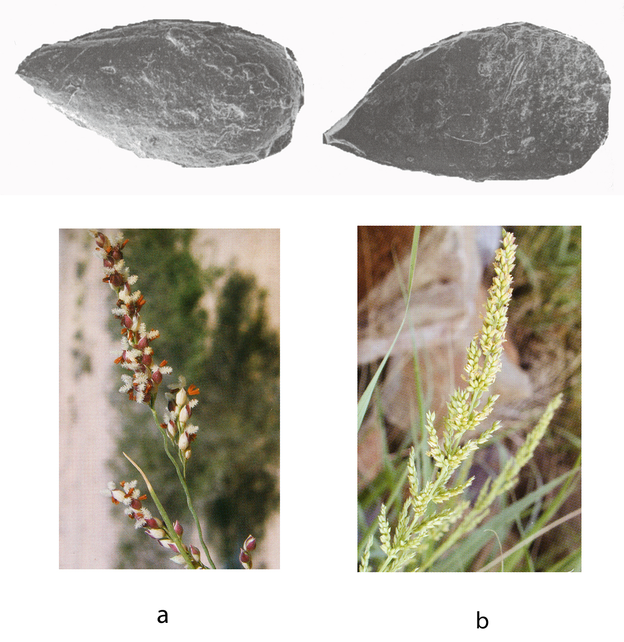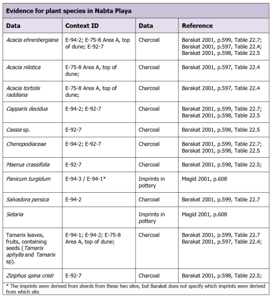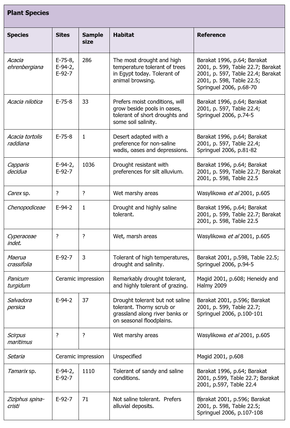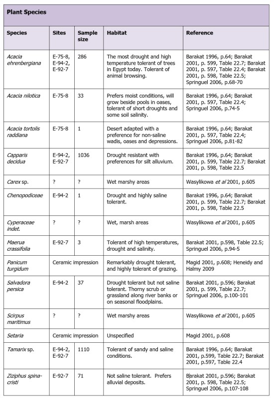 Heavy deflation and poor survival of plant remains prevent the reconstruction of the botanical profile at Nabta, but the few remains provide a useful insight into the local environment. The species shown in table 8.5 are typical of arid and semi-arid environments. Their saline-tolerant root systems form phytogenic hillocks and pioneer water beds, wells, depressions, wadis and water tables up to 8m deep (Barakat 2001, p.596). At E-75-8 Acacia taxa were well represented. Acacia is very resilient in arid environments where it shares an environment with pastoralists, in spite of frequently intensive grazing. Seeds are propagated by browsing herbivores, meaning that acacia has a high recovery rate (Selemani et al 2013, p.146). Tamarisk taxa pioneer around open water bodies, wells and in wadis and are saline tolerant. Sedges from E-75-8 and club-rush, suggest marshy environments along playa edges (Barakat 1996, p.64; Barakat 2001; Wasylikowa et al 2001). At E-94-2 charcoals from all hearths produced Tamarix sp., Acacia ehrenbergiana, Capparis decidua, Salvadora persica and chenopodiaceae, showing a tendency towards contracting desert vegetation (Barakat 2001, p.598). Schild and Wendorf summarize this as “contracted groundwater-bound desert vegetation” (2001b, p.49).