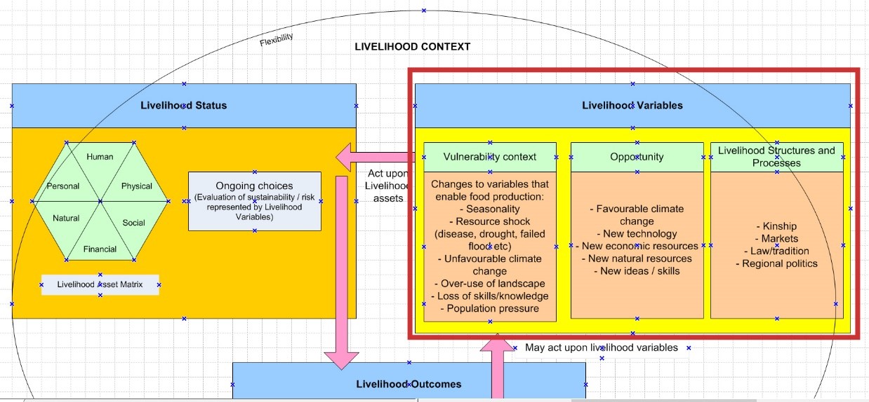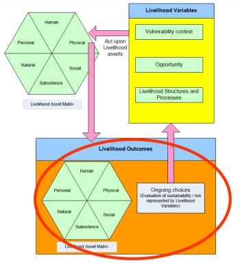 The Livelihood Outcomes reflects changes that take place when the Vulnerability Context acts on the Asset Matrix (figure 8.21). This is discussed below in terms of three outcomes: economic, environmental and cultural.
