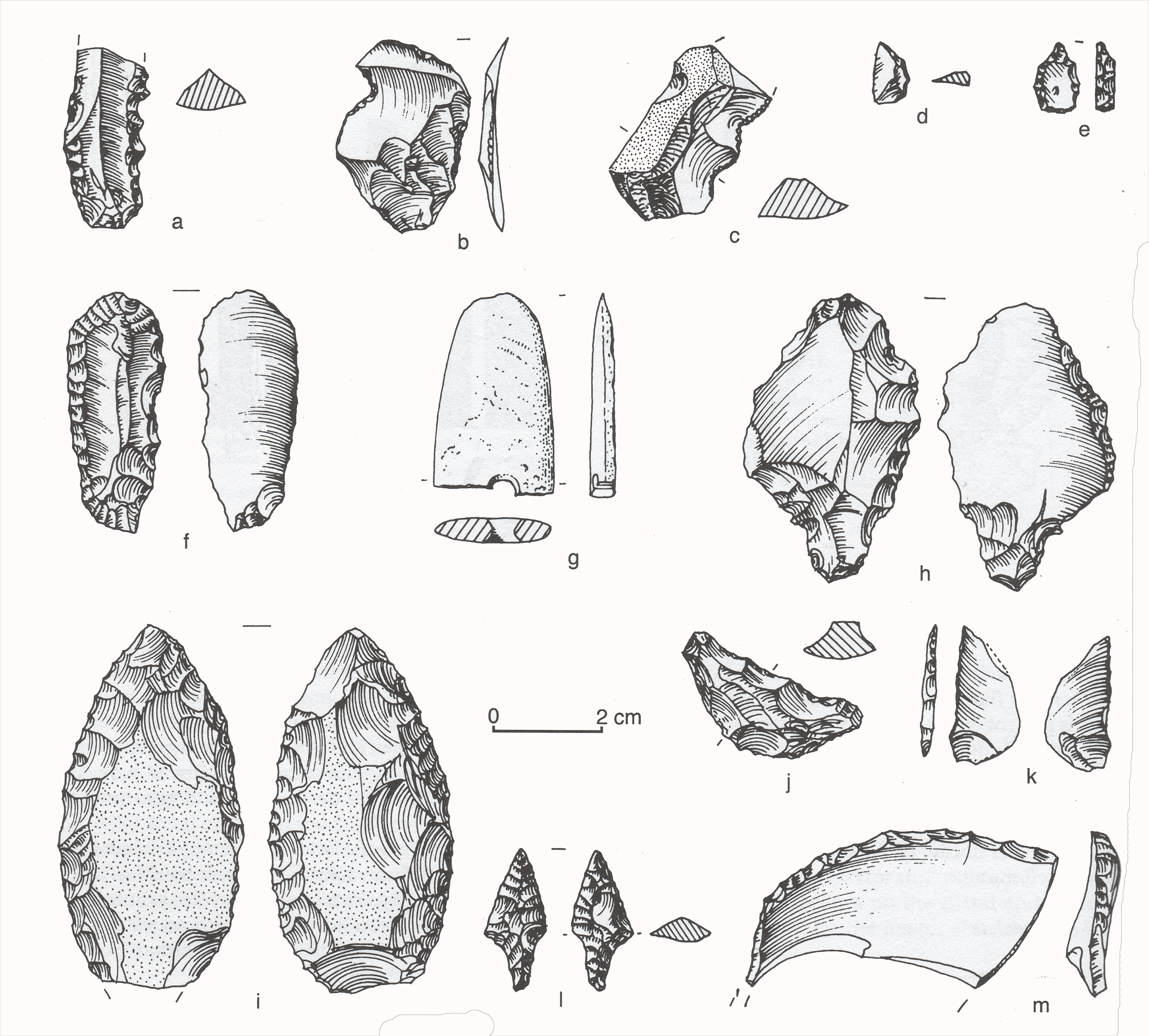 a, c denticulates; b, notch; d, lunate; e, varia; f, endscraper; g, groundstone;