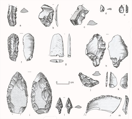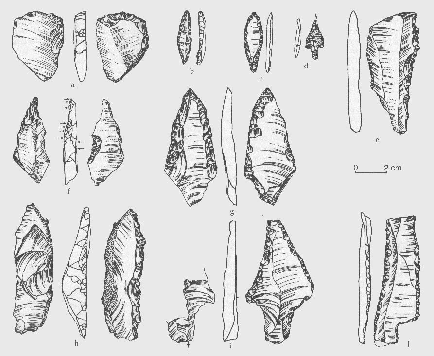 e, retouched piece; f, denticulate; g, groundsetone; h,i, worked bone.