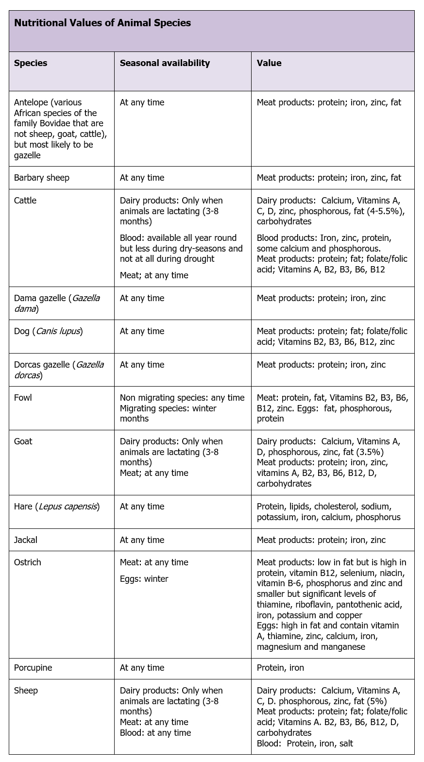 Table 8.14 – Potential nutritional contributions of animal species in the Ru’at el Baqar