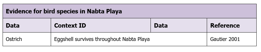 Gautier’s analysis indicates that cattle are a minority in the bone assemblages (61.1%), whilst sheep/goat represent twice the amount (12%), and wild species the rest. The difference between cattle and sheep/goat can be accounted for by either Nabta groups using cattle herds for blood and milk or being reluctant to slaughter cattle (Gautier 2001, p.631). In purely dietary terms: “if we turn to dietary ratios, it becomes clear that livestock contributed substantially more to the diet, because the live weight and hence dressed carcass weight of sheep or goat (50kg?) and cattle (250g?), exceed markedly that of hare (3.5kg) and the combined gazelles (20kg).” Gautier estimates that by the Ru’at el-Baqar cattle make up about 12% of the diet and and small livestock make up around 26.8% of the diet, whilst wild species make up 61.1% (Gautier 2001, p.632). Porcupine meat is considered to be a delicacy in North and West Africa and is slow-moving, meaning that it is easy to catch, and it can weigh up to 30kg (ARKive, n.d.). Combined with the likelihood that cattle, goat and sheep were used for blood and milk as well as, or as an alternative to meat, this argues that the potential diet for the short season at Nabta was potentially very strong on animal products and high in protein. Ostrich has a number of nutritional benefits. Their meat is rich in protein iron and zinc.