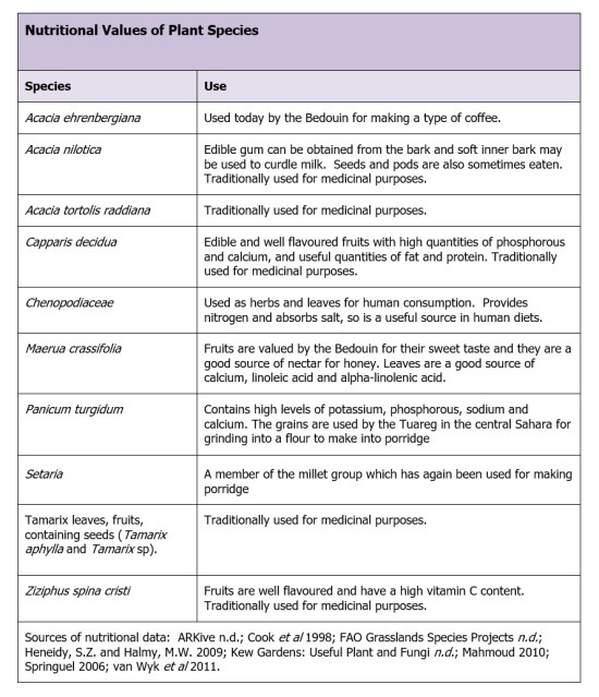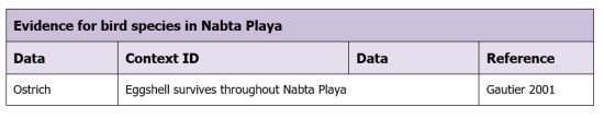 During the mid-Holocene the Western Desert consisted of dry savannah, with Sahelian type conditions, consisting of “just a little grass after the rains in the summer” (Schild and Wendorf 2004, p.11). The species represented in the archaeological record at Nabta are shown in Table 8.5.