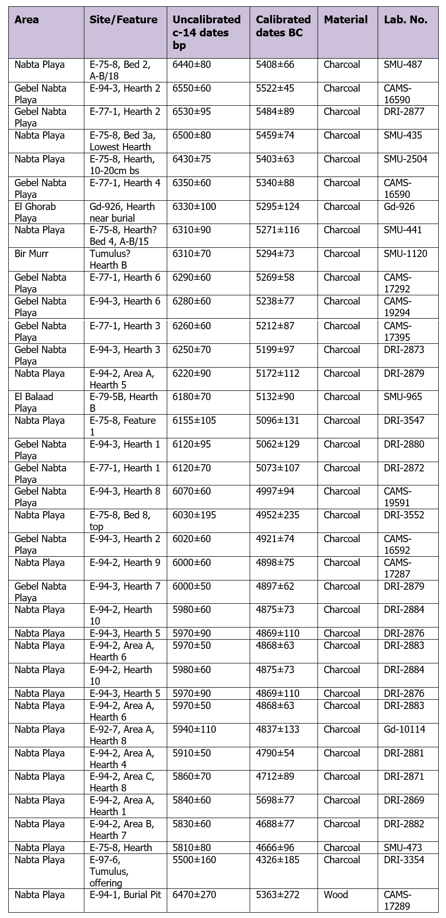Table 8.3 provides a list of the dates listed in Wendorf, Schild and Associates (Schild and Wendorf 2001c, p.53-54, Table 3.1) and calibrated using quickcal2007 ver1.5 (Cologne Radiocarbon Calibration and Paleoclimate Research Package (University of Cologne) http://www.calpal-online.de/index.html).