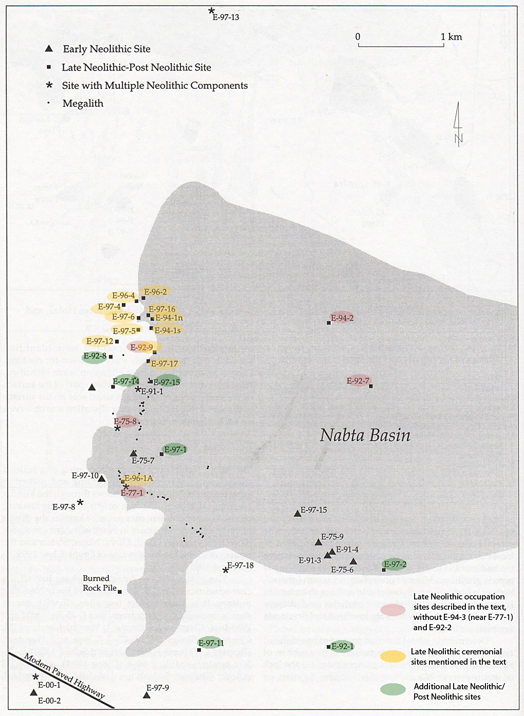 Nabta is a good example of what Schlanger (1992) refers to as a “persistent place,” a concept that has been used in many studies since that date, and incorporates the idea that certain localities were used repeatedly over the long term, due to their suitability of their particular characteristics for certain activities, natural features that attract repeated occupation and the accumulation of material remains at those localities (Schlanger 1992, p.91). At Nabta, groups were drawn repeatedly to the rain-activated playa basin and the resource potential of pasture and game. Repeat visits date from the beginning of the early Holocene to the end of the middle Holocene. Hofman emphasizes that repeated use of the same areas and sites reinforces knowledge about those areas and improves the chances of livelihood sustainability means that scheduled return visits are desirable (Hofman 1994), whilst Hunn and B. Smith both describe how this type of knowledge becomes embedded in traditions based on a background of memory and past experience (Hunn 1993, p.13; B. Smith 2011, p.263), which also contribute to sustainability.