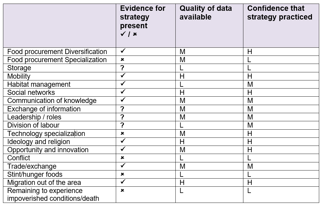 The available data has been checked against the list of risk management strategies in Section 5.4 in Chapter 5 and copied into Appendix B and forms the basis for a comparison of all areas. I have used a yes/no/? judgement on whether there is evidence for an activity, and have also indicated how much confidence there is in the data supporting that the judgement, using a High (H), Medium (M) and Low (L) scale. Table 8.17 shows what types of strategy are evident in the archaeological record. The contents are discussed in brief immediately afterwards.