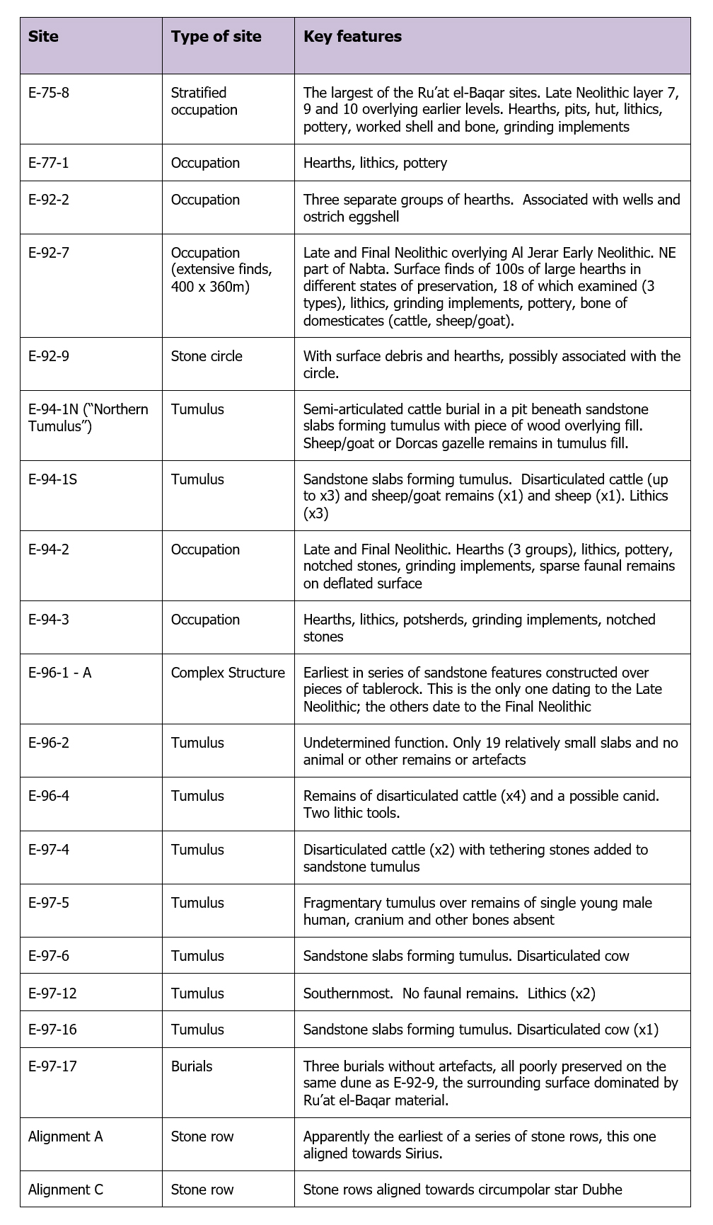 There are no signs of conflict or competition for resources, and the use of Nabta over a period of centuries argues that it was regarded as a secure and attractive resource. Towards the end of the Ru’at el-Baqar conditions were certainly highly variable as aridification leading up to the arid phase became more obvious and was eventually accompanied by abandonment of the desert areas. Feelings of security may have been undermined towards the end of the Ru’at el-Baqar when Nabta, and whatever ideas were tied up in the ceremonial centre, had to be abandoned.