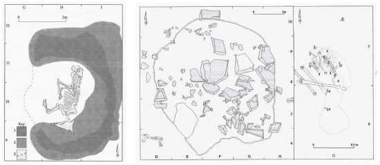 The only burial that is securely dated to the Ru’at el-Baqar is the one in tumulus E-97-5. Although not particularly well preserved, and missing its cranium and other parts of the body, the skeletal data “suggest a young and healthy individual” with no sign of stress on lumbar vertebrae (Applegate et al 2001l p.478). It is impossible, however, to extrapolate from this one example. The much less securely dated burial at E-97-17 relateds to old age at the time of death, with severe dental attrition consistent with an “intensive gatherert” type diet and the teeth and mandible are suggestive of Sub-Sharan affinties (Irish 2001, p. 523).