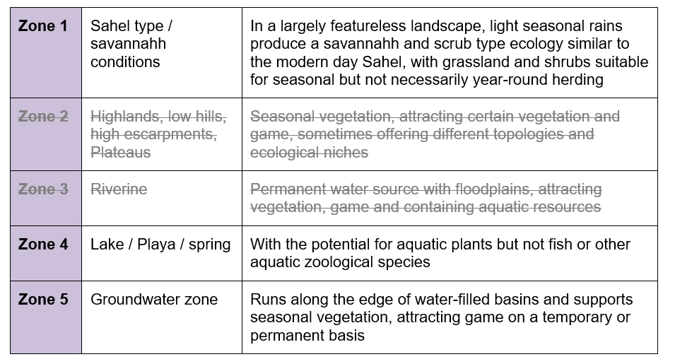 Table 8.4 summarizes the main types of zone available for exploitation during the Late Neolithic Ru’at el-Baqar, with zones unavailable shown greyed out and crossed through. These aspects of the landscape are discussed below.