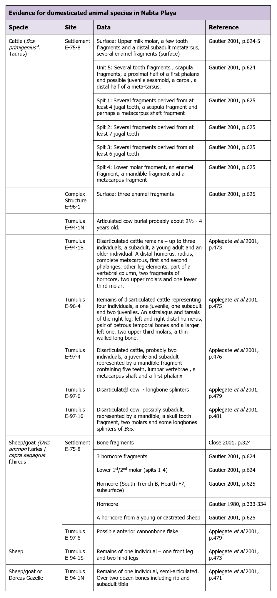 This table suggests that throughout the mid-Holocene occupation at Nabta, access to food for the short period of occupation was deemed to be sufficient for the area to be used throughout the Ru’at el-Baqar, and visits to Nabta would therefore have been relatively low risk. It seems indisputable that Nabta was only occupied for short periods, and both the proximity of the Nile and the Nile-affiliated ceramics support the idea that the river was part of the Nabta subsistence strategy. However, should the proposal that Nabta was only used seasonally in conjunction with more permanent occupation along the Nile be incorrect, these findings would need to be completely revised.