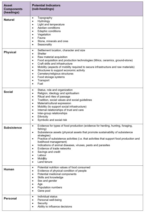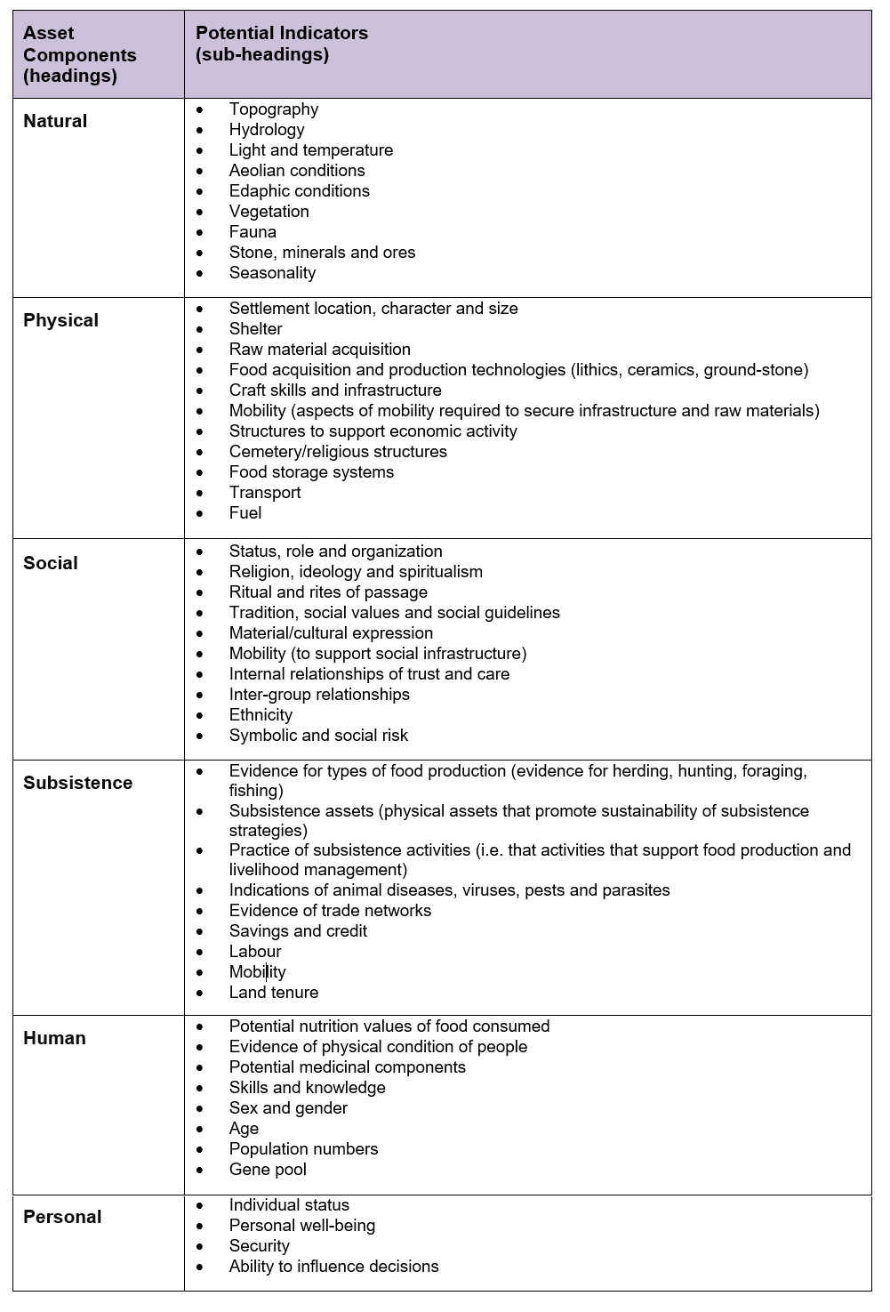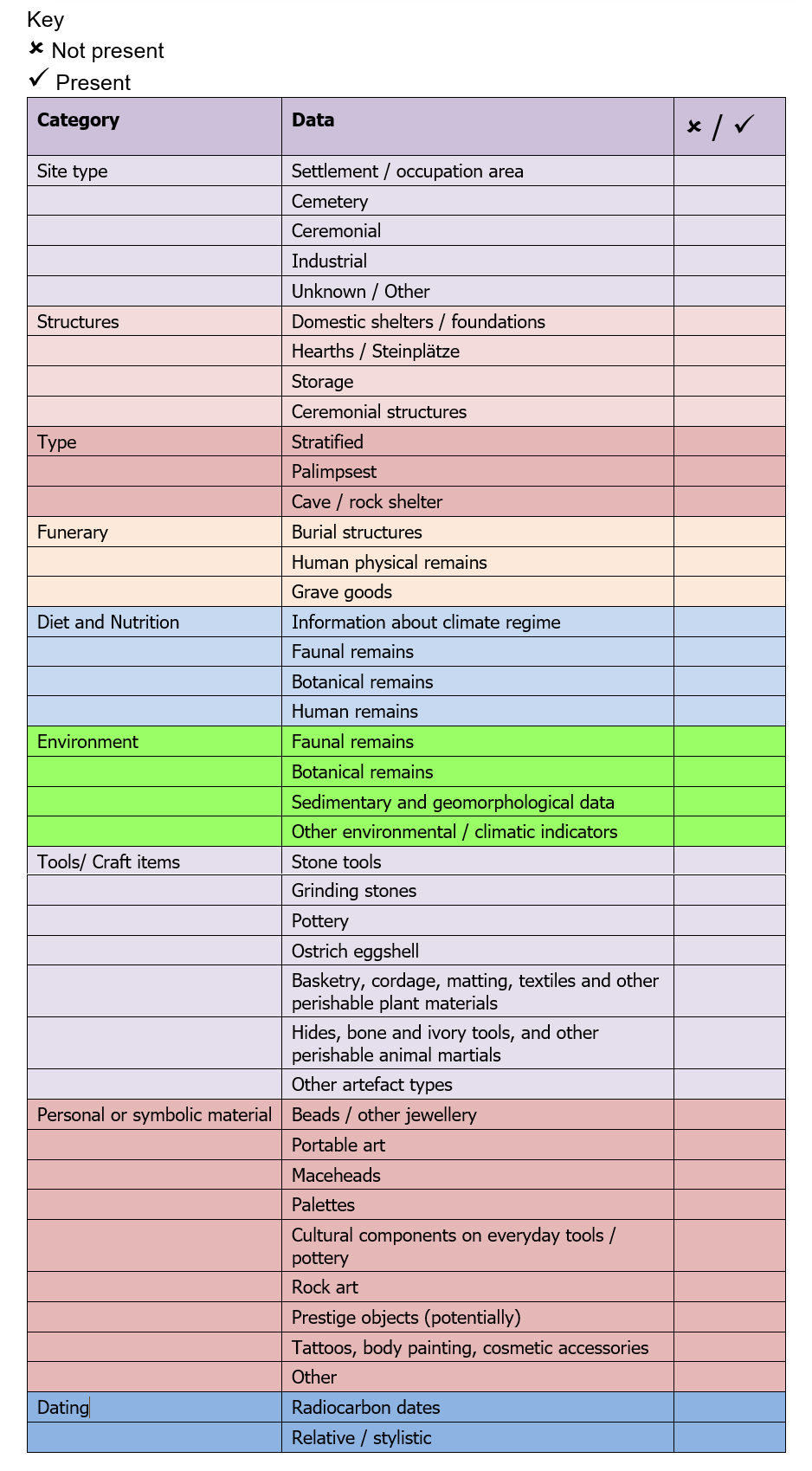 The available data is presented in tabular form in order to enable anyone reviewing a completed SRL framework to see what types of information are available at a glance. It is not intended to provide detailed information, but to give an instant impression of what type of data is available at the most superficial level. This table has been assembled for the types of data likely to be found in the eastern Sahara; it would later for different regions, periods and different types of dataset.