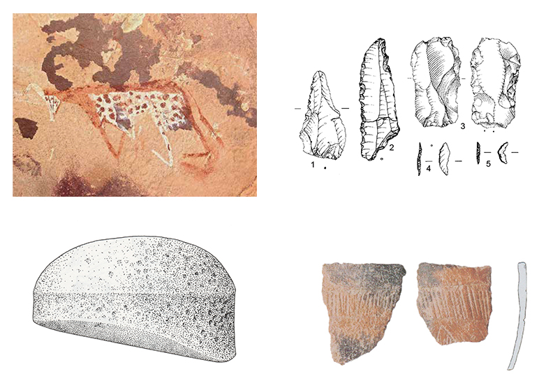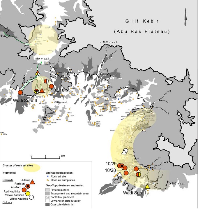 | Wadi Sura II (also known as 09/2) | Occupation and rock art | Extensive panel of Gilf B rock art with some earlier and later pieces. Occupation debris dominated by Gilf B but with some Gilf C lithics and ceramics. |