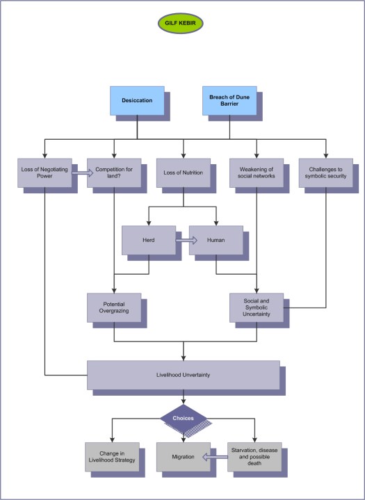 The switch from tolerable to intolerable conditions in the area as a whole is unlikely to have been sudden, but deterioration would have led to increasingly unpredictability with drought tolerant species increasingly dominant and greater difficulty of environment to recover from droughts and any over-grazing. However, the breaching of the dune barrier during a period of environmental deterioration eliminated the Gilf Kebir as a viable part of the seasonal round. Without the dune lakes, the Gilf C livelihoods would have been tipped from a status of risk to one of uncertainty. As observed in section 4.3 (External Livelihood Structures and Processes) no obvious other factors are obvious potential contributors to account for the departure of groups from the Gilf Kebir, if the inhabitants were wished to sustain a herding livelihood. Even if they had discussed a switch to a hunting strategy, it is very unlikely that sufficient food and water were present to sustain more than a few people.