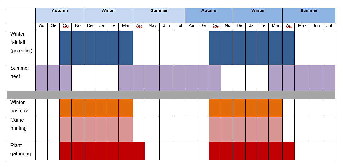 Table 4 summarizes the main types of zone available for exploitation during the Late Neolithic Ru’at el Baqar, with zones unavailable shown greyed out and crossed through: