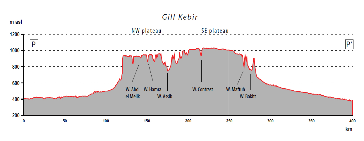 The Gilf Kebir is a dissected plateau consisting of two plateaus connected by a small land bridge, covering an area of c.90,000km2 (Linstädter 2007, p.20). The northern-western plateau is the Abu Ras plateau approximately 140km north to south and 40km east to west, the larger southern one is named the Kemal el-Din or Gilf Kebir plateau, approximately 120km north to south and 80km east to west (figure 2). Gilf C remains are largely found in the southern plateau in the east, with only ephemeral remains found from the northern section (Kuper et al 2009, p.8). Both plateaus are dissected at their edges by a fringe of dried valleys which, in the past, channeled surface run-off and reach lengths of up to 20km long and 4km wide (Linstädter and Kröpelin 2004), mainly extending from west to east on the southern plateau and south to north on the northern plateau. At its greatest height the plateau reaches 300m, 1100m a.s.l., with frequent pediments at its feet, surrounded by peneplains covered with immense bodies of sand (Darius 2013, p.70) (figure 3).