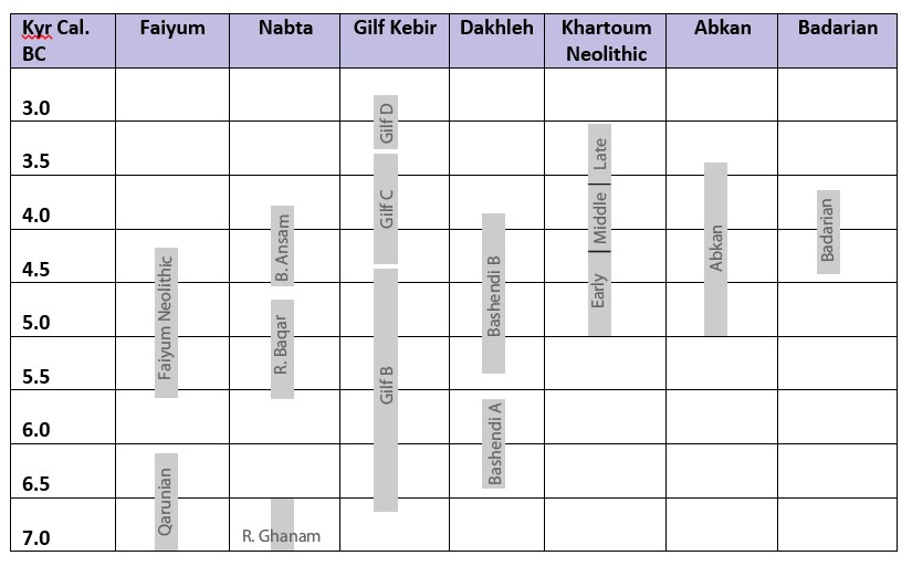 Plenty of dates are available for all of the case studies except the Badarian, which was largely excavated before the use of radiocarbon dating (Brunton and Caton Thompson 1928; Brunton 1937; Brunton 1948; Caton-Thompson and Whittle 1975). All dates available are tabulated in the case studies. Uncalibrated dates were calibrated using quickcal2007 ver1.5 (Cologne Radiocarbon Calibration and Paleoclimate Research Package (University of Cologne) http://www.calpal-online.de/index.html). A particularly important survey of radiocarbon dates from 150 sites that was correlated with human activities and climatic processes during the Holocene of the eastern Sahara was published in 2006 (Kuper and Kröpelin 2006) demonstrating a north-south arc of abandonment beginning at c.5300BC. This has enabled comparison between different archaeological phenomena across wide geographical areas (Kuper and Kröpelin 2006; Kuper and Riemer 2013). In terms of the case studies, all dates have used the conventional rather than the accelerator method.