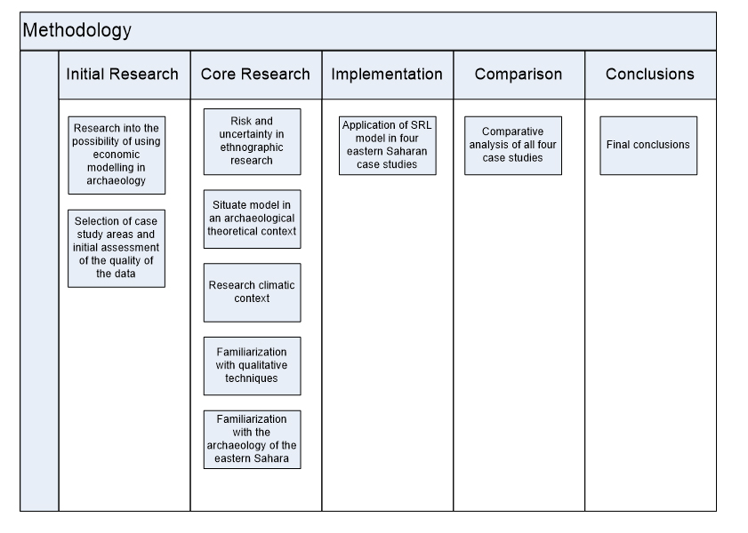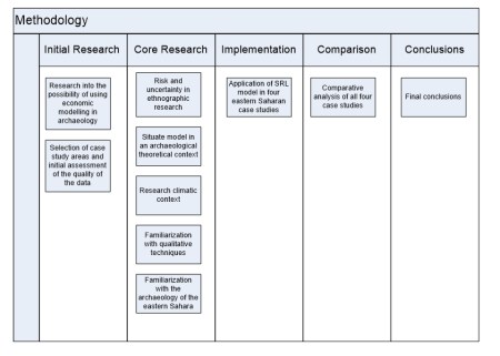 The purpose of the thesis is not to solve specific archaeological problems such as, for example, how domestication occurred in the eastern Sahara. The intention is to use the SRL approach to explore concepts such as risk, opportunity and sustainability in marginal environments. To test the viability of the SRL approach for answering specific questions of the archaeological data, a set of key questions are asked, and additional techniques are used to maximize the value of the SRL approach, discussed in Chapter 2.