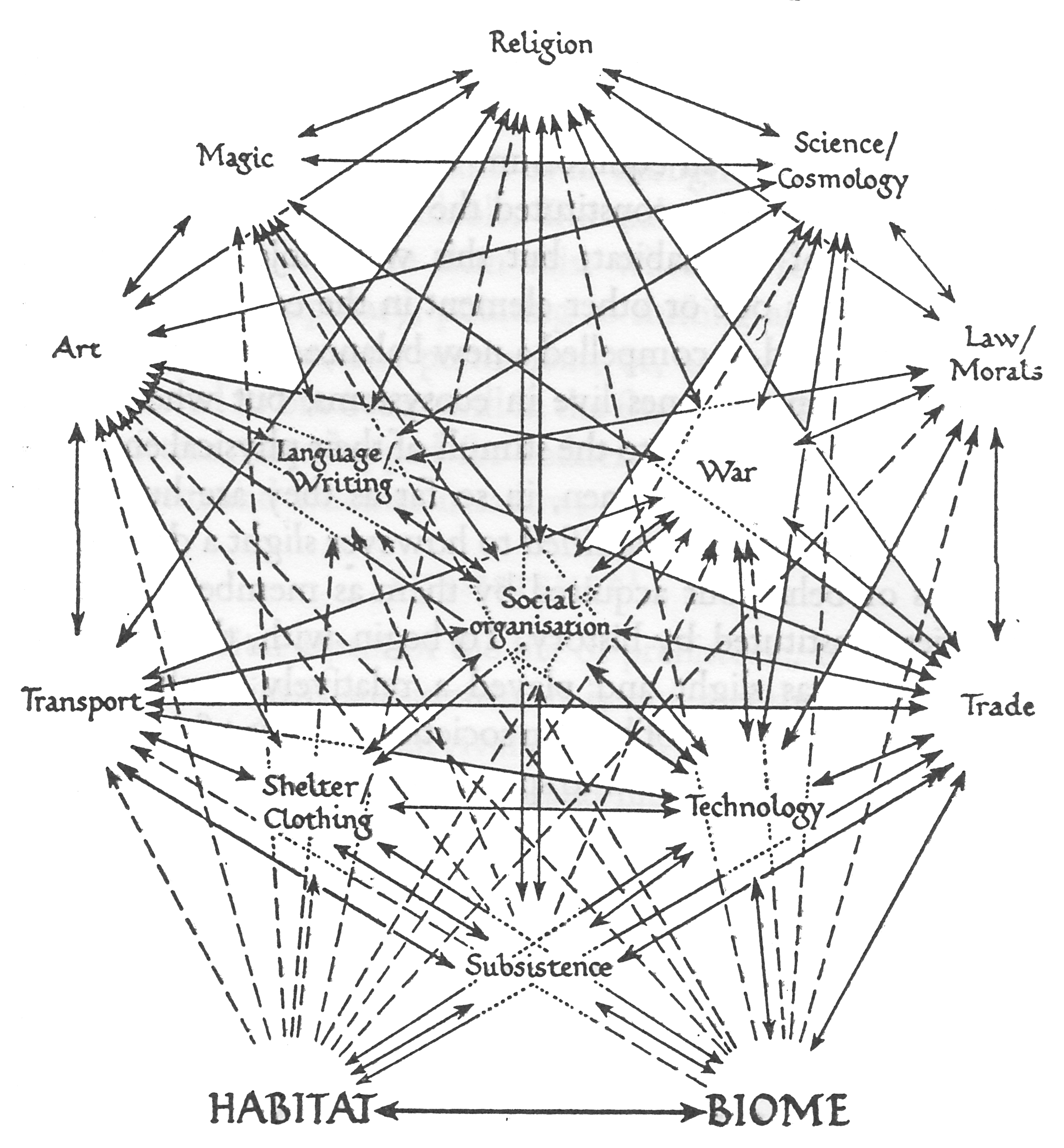 David Clarke proposed a type of systems theory based analysis (Clarke 1973, 1978). His main works on the subject were Analytic Archaeology (1968, updated in his 1978 second edition) and Models in Archaeology (1972). In Analytical Archaeology he worked through the medium of artefacts and his work seems, to an extent, an extension of culture history approaches, with a heavy emphasis on object classes and culture, but he was interested in both cultural and economic concepts expressed within classes and he wanted to place far greater emphasis on explicitly theoretical approaches than his predecessors, seeking to systematize archaeological theory (Clarke 1968). He saw systems as self-regulating, equilibiral, patterns that altered as aspects in parts of the network were influenced or mutated, not unlike the ecological proposals of the same period (cf. Linstädter, A. 2010). Clarke’s famous comment that archaeology was “the discipline with the theory and practice for the recovery of hominid behaviour patterns from indirect traces in bad samples” (Clarke 1973, p.17) provides an insight into his interest in establishing robust theoretical and methodological procedures for examining archaeological remains and reconstructing the past. However, this particular vision of a model of the past (figure 3.5) was not significantly different conceptually from Grahame Clark’s, although David Clarke’s incorporated ongoing time as an element, explicitly indicating that the system may and probably will change, that human activity is constrained rather than enabled by environmental factors, and that religious activity is a more integrated component of society (Bintliff 2014; Clarke 1968). Clarke was criticized for not supporting his work with ethnographic research, meaning that it remained abstract and untested (Torrence and Van der Leeuw 1989, p.2).