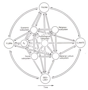 Grahame Clark’s approach is a good example of functional systems approaches, with basic components of social organization linked together in ways that indicated causal relationships should aspects of one or more than one component change, influencing the functionality of the system as a whole, which he expressed in a very simple diagram (J.G.D. Clark 1939). By 1952 Clark had to come to the conclusion that systems were self-regulating, a set of interdependent balances (Clark 1952, p.8), with periods of disequilibrium representing periods of transition between phases of equilibrium, where “the tendency must always have been to achieve a new harmony between society and its external environment” (1952, p.9). He saw economies as “an adjustment to specific physical and biological conditions of certain needs, capacities, aspirations and values” (1952, p.7). By 1957 he had developed this into the complex systems model shown in figure 3.3 (J.G.D. Clark 1957, p.175). The diagram clearly indicates that different aspects of society are irrevocably inter-dependent, and it both acknowledges snapshots of time and emhasizes that changes happen over time. It also emphasizes the connections between different aspects of society, their interdependencies. The importance of this diagrams is that it clearly linked economic, domestic, ecological and cultural elements, indicating that they are all important in influencing outcomes, but he saw all aspects of livelihoods as driven by economic factors, which coloured his explanations of how livelihoods may be understood. Although he asserts that the form of economic activity demonstrated by a community is “to a greater or lesser degree influenced or even conditioned by culture,” an idea that is not a million miles away from post-processual ideas, he sees the mediator between culture and the ecological framework as “stable forms of economy” that result from perfect adjustments within his scheme (Clark 1952, p.7).