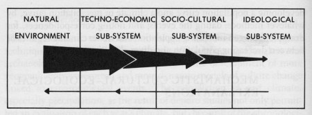Following Steward (1937) and Willey (1953), many studies departed from the scale of the site and began to consider the landscape in which sites were distributed with a view to understanding entire socioeconomic systems, and this led to a recognition of the possibility of considerable regional diversity (Willey 1953; Trigger 1996, p.380). Gumerman distinguishes between mechanistic models on the one hand and dynamic and systemic conceptual models on the other. Mechanistic models represented culture and environment as an integrated whole, but placed the environment as the dominant and conditioning component driving culture and ideology, and were often expressed graphically in a linear fashion (figure 3.1) (Gumerman 1988b, p.7-9). This type of model was joined by and largely replaced by models that were focused on inter-relatedness of cultural and ecological concepts, and importantly emphasized that ecological and human relationships were intimately connected (figure 3.2) (Gumerman 1988b, p.13-14). In some models of human existence the dichotomy between natural and cultural systems is firmly retained but the processes that act upon these twin aspects are given more balanced influence on the overall system (e.g. Anderson 1973; Euler et al 1979; Flannery 1968; Rappaport 1979).